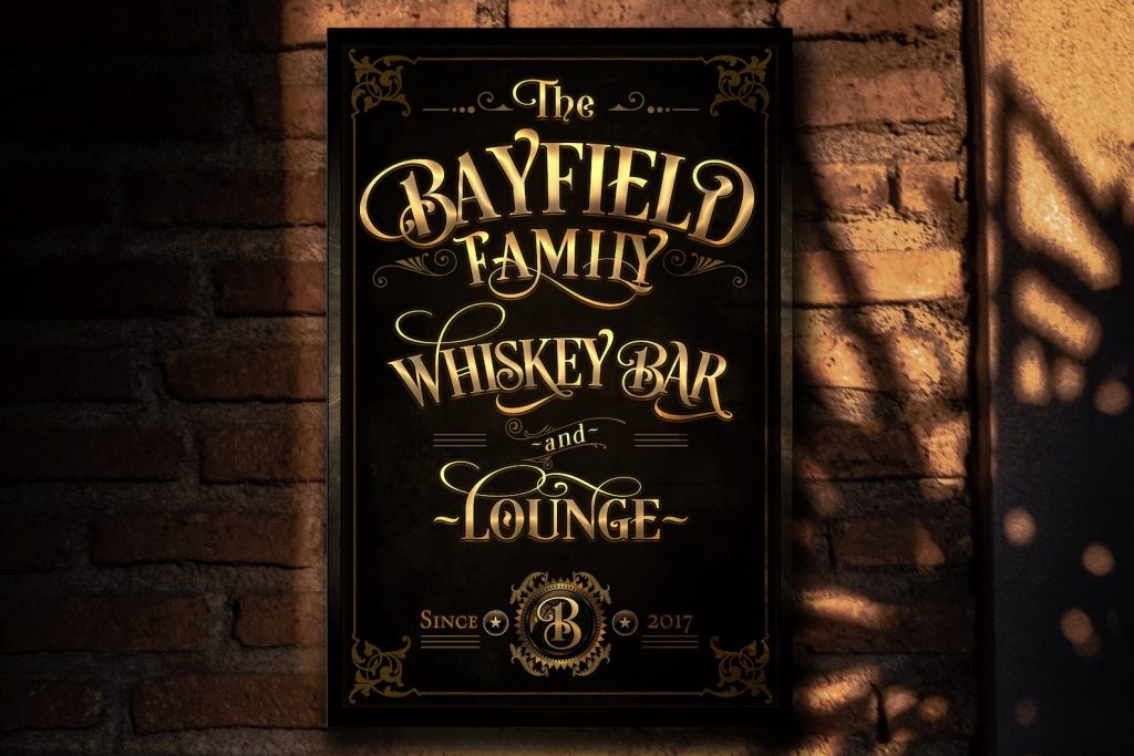 Here9;s a vertical/portrait Whiskey Bar & Lounge sign for that special wall space where a horizontal/landscape sign won9;t fit. This personalized bar sign offers retro, Vegas Gold, look and feel. I will customize this Whiskey Bar & Lounge sign by integrating your name and established date into the vintage art you see.