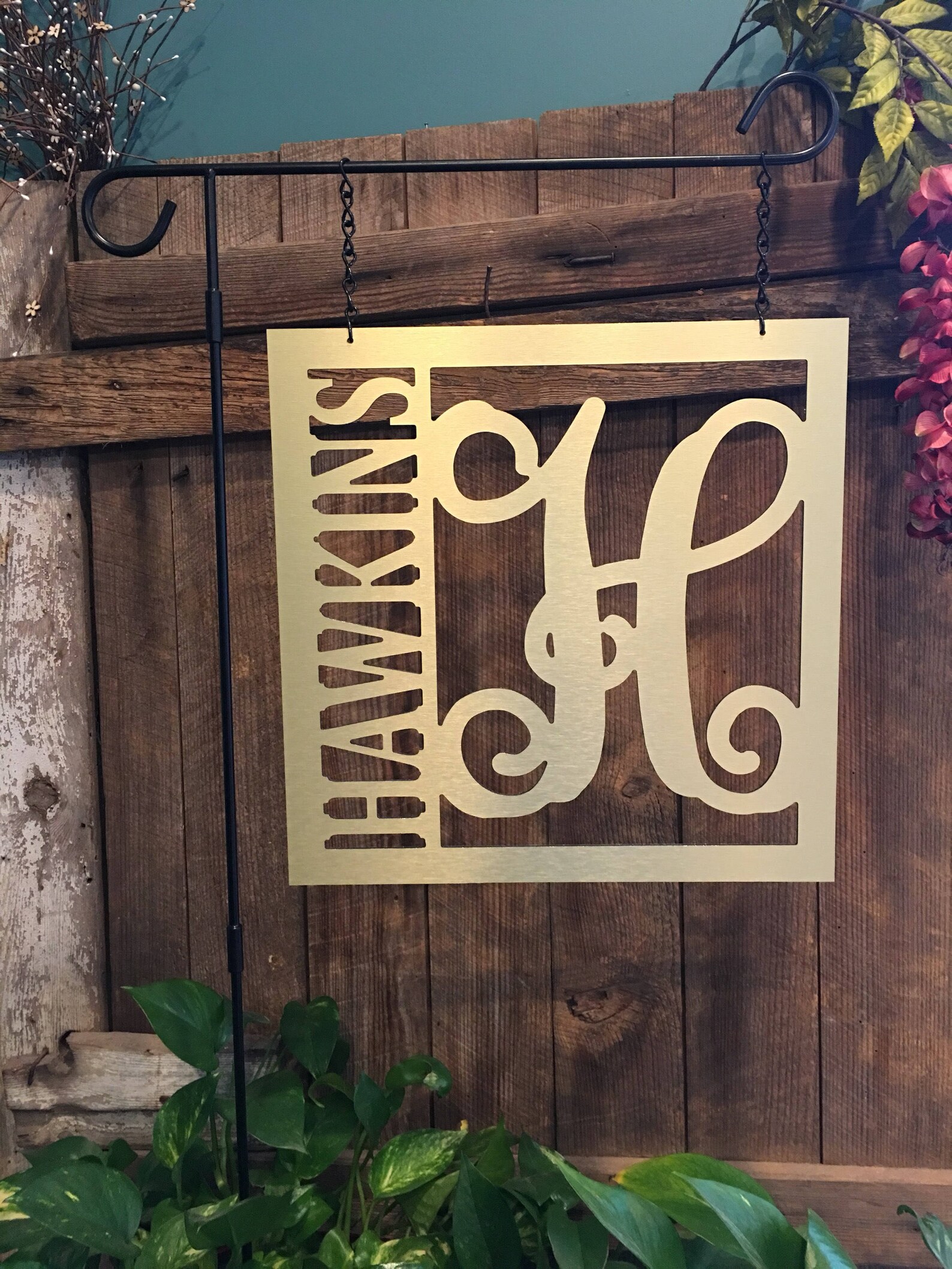 Dress your front yard up with your family name with this Monogram Metal ACM Name Garden Flag. Designed to be an elegant piece of yard decor, this front yard sign proudly boasts your family name and initial while looking elegant and classy! This custom name sign will not only withstand the test of time but also the elements with its aluminum composite material body. Create yours as a wreath accessory for your front door.